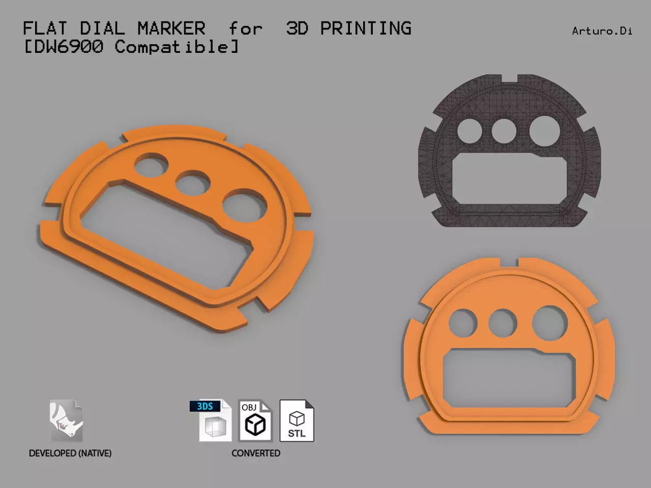 Available on files: Closed Mesh model of the dial for 3d print. [.STL .OBJ .3DS]Closed Polysurface (WaterTight Model) + Mesh of the dial [.3dm]