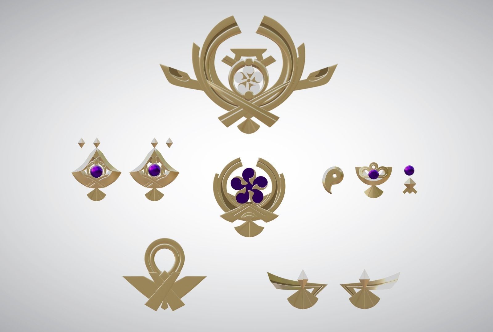 The archive includes models:1) Diadem; 2) Amulet; 3) Decoration on shoes; 4) Dress bottom decoration; 5) Hemisphere on a tassel; 6) Bead on a tassel; 7) Earrings; 8) Rhombic bead; 9) Narukami's wisdom; 10) Forearm decoration; 11) Detailing for diadem and earrings models.