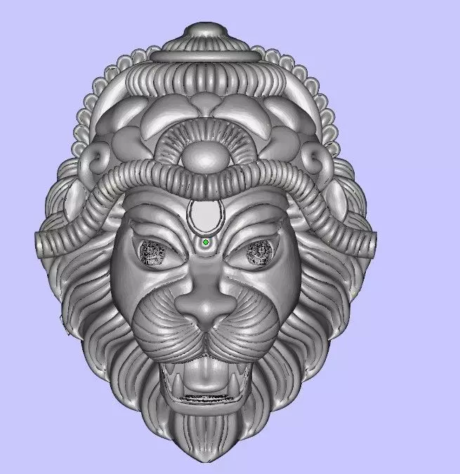 The image shows a highly detailed 3D rendering of a lion's face, possibly inspired by traditional Hindu or Indian architectural and sculptural designs. Here’s a detailed breakdown of its features: