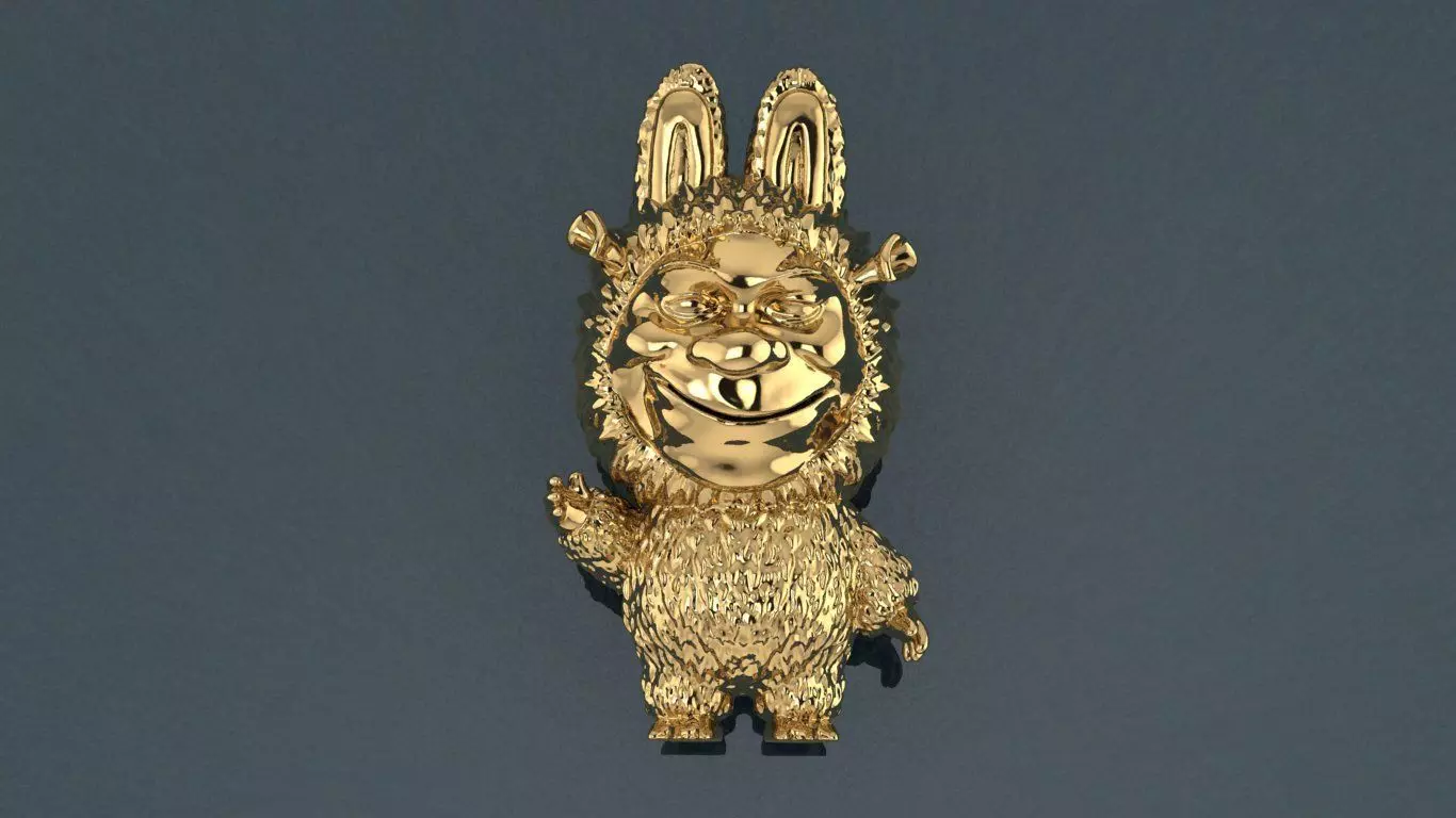 An extraordinary mash-up creation, this piece merges the whimsical form of Labubu with the unmistakable grin of a certain beloved green ogre. Crafted in radiant high-polish gold, its textured fur, towering ears, and cheeky expression create a collectible unlike anything else. Equal parts parody and pop-art luxury, this design is perfect for those who appreciate humor wrapped in elegance.