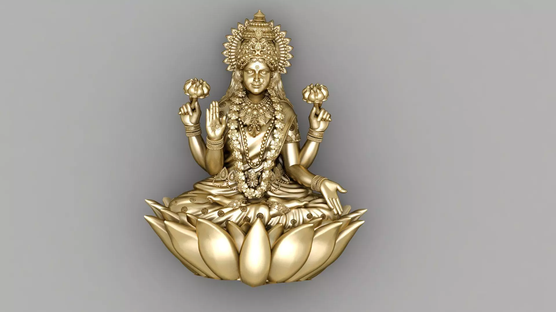 This is a high-quality 3D model of Goddess Lakshmi, the Hindu goddess of wealth and prosperity.The model is fully detailed with ornaments, lotus petals, and smooth surfaces suitable for both resin 3D printing and jewellery casting.