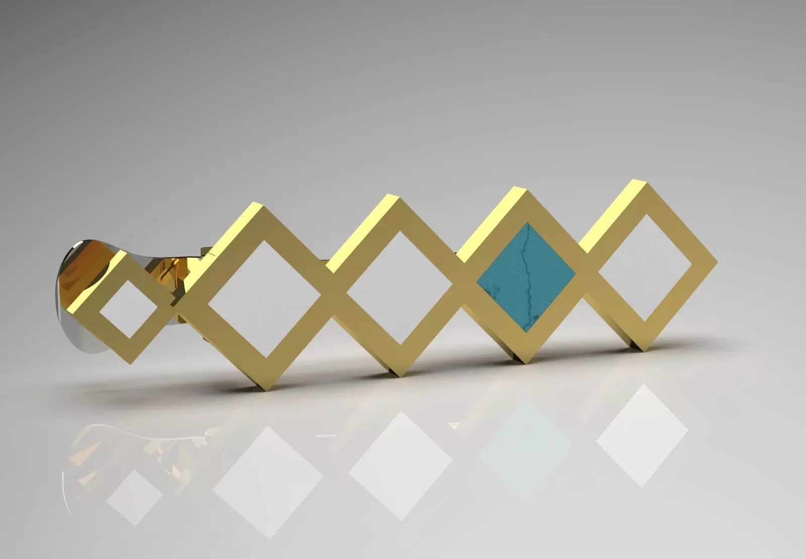 This piece of jewelry is a striking and unique accessory with its geometric and modern design inspired by the diamond shape. This model showcases a combination of shiny metal and turquoise stone, which gives it a special look.