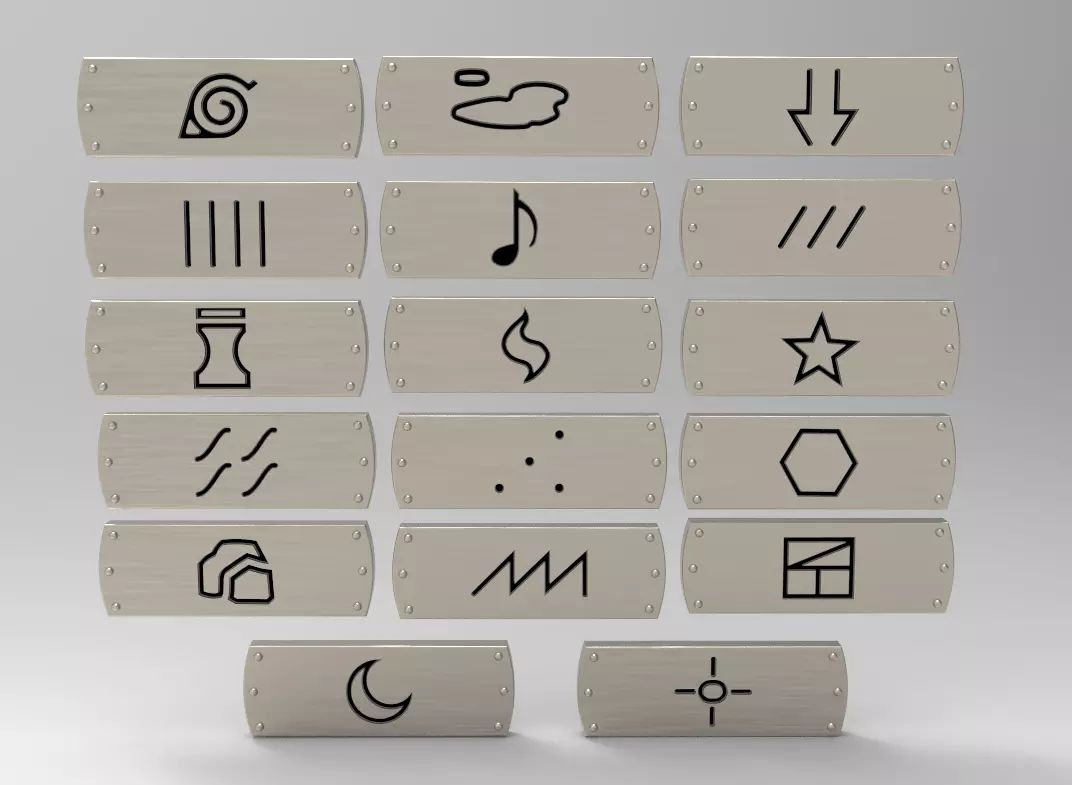 This product is a high-quality 3D set of Naruto Ninja Village Symbol Plates, based on the classic forehead protector badges used by shinobi in the Naruto series.Each plate includes accurate engraving lines and screw-hole details, fully modeled for realistic rendering, cosplay props, and 3D printing.