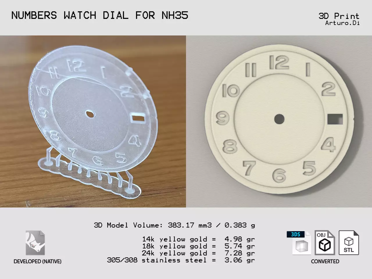 A watch dial with Number markers compatible with the Automatic movment NH35. For casting purposes, check the grams calculus on the front page.