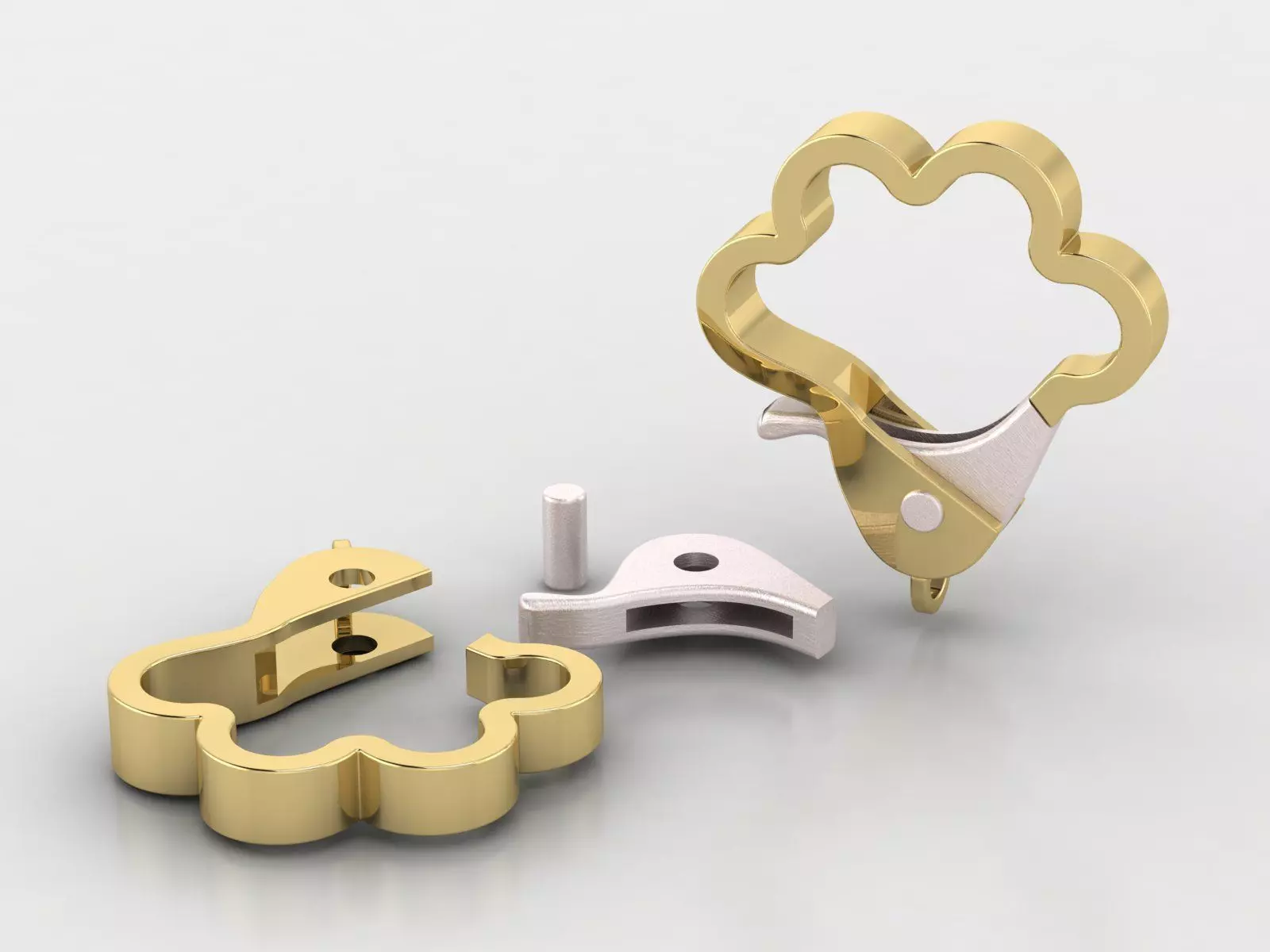 +3 parts consist of: -1 outside frame designed like paw.-1 inner piece that functions as the locking part, operating with the help of an internal spring mechanism. -1 pin.
