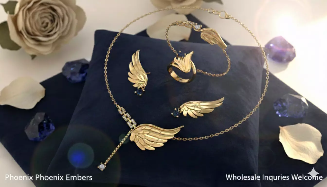 Inspired by the mythical bird of rebirth, the Phoenix Embers Collection is a masterclass in dramatic elegance. This exclusive set features sculpted gold wings, meticulously detailed to capture the fluid movement of flight.