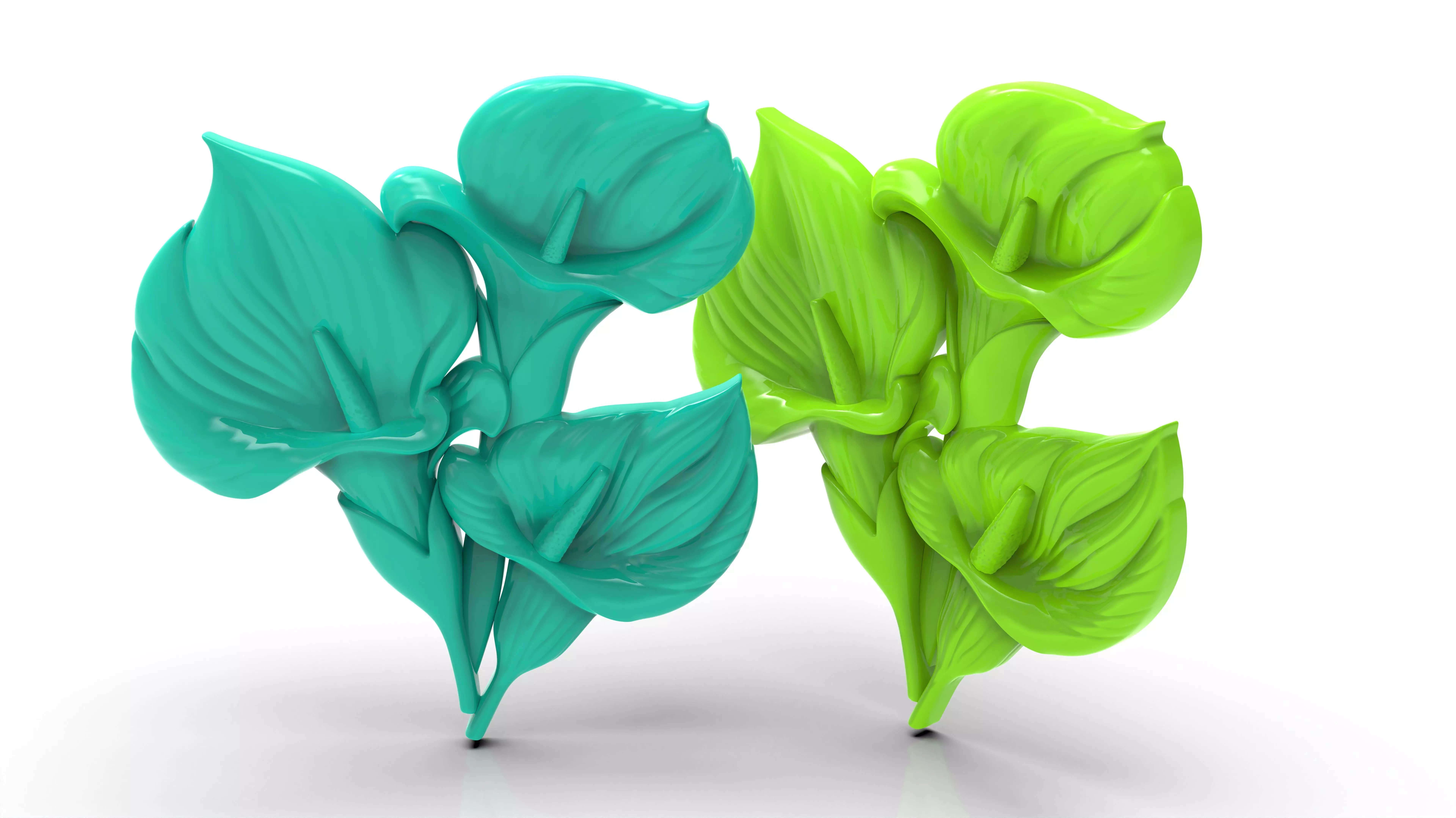 Each flower is sculpted with smooth organic contours, and the central spadix detail is clearly defined, enhancing the natural appearance. The stems and leaves are integrated into a balanced composition, creating a harmonious and visually appealing floral cluster.