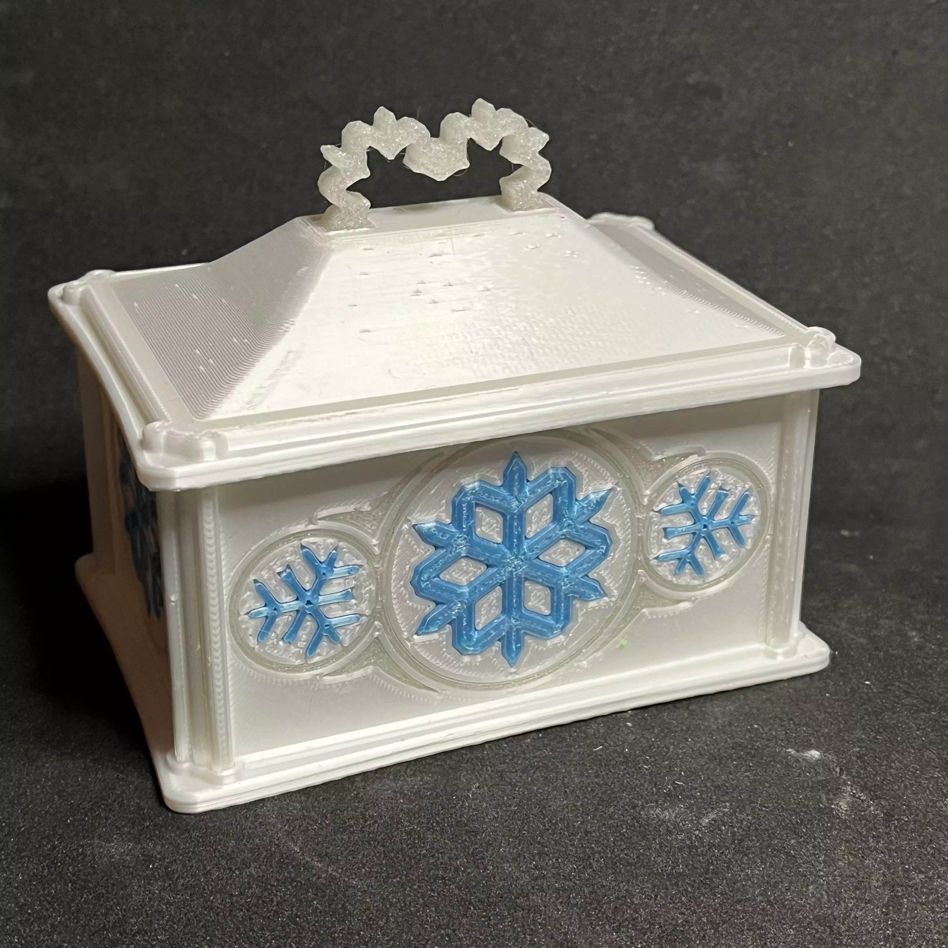 For all you fans of snow-related Disney cartoons (I think you know which one I'm talking about), may I present the IceBox. Compact and decorative so it won't take up a huge amount of space on your dressing table but still big enough for earrings, pendants, rings and anything else you feel like keeping in it. And if you should happen to accidentally Let It Go (see what I did there) when you pick it up... well it may look delicate but the glass-fibre filament actually produces a stronger finished product than the ABS I usually use, so it may look like ice but it certainly won't shatter! If you're printing it yourself I very much recommend printing it in a translucent or transparent filament, if you print it in one solid colour it won't look nearly as good.