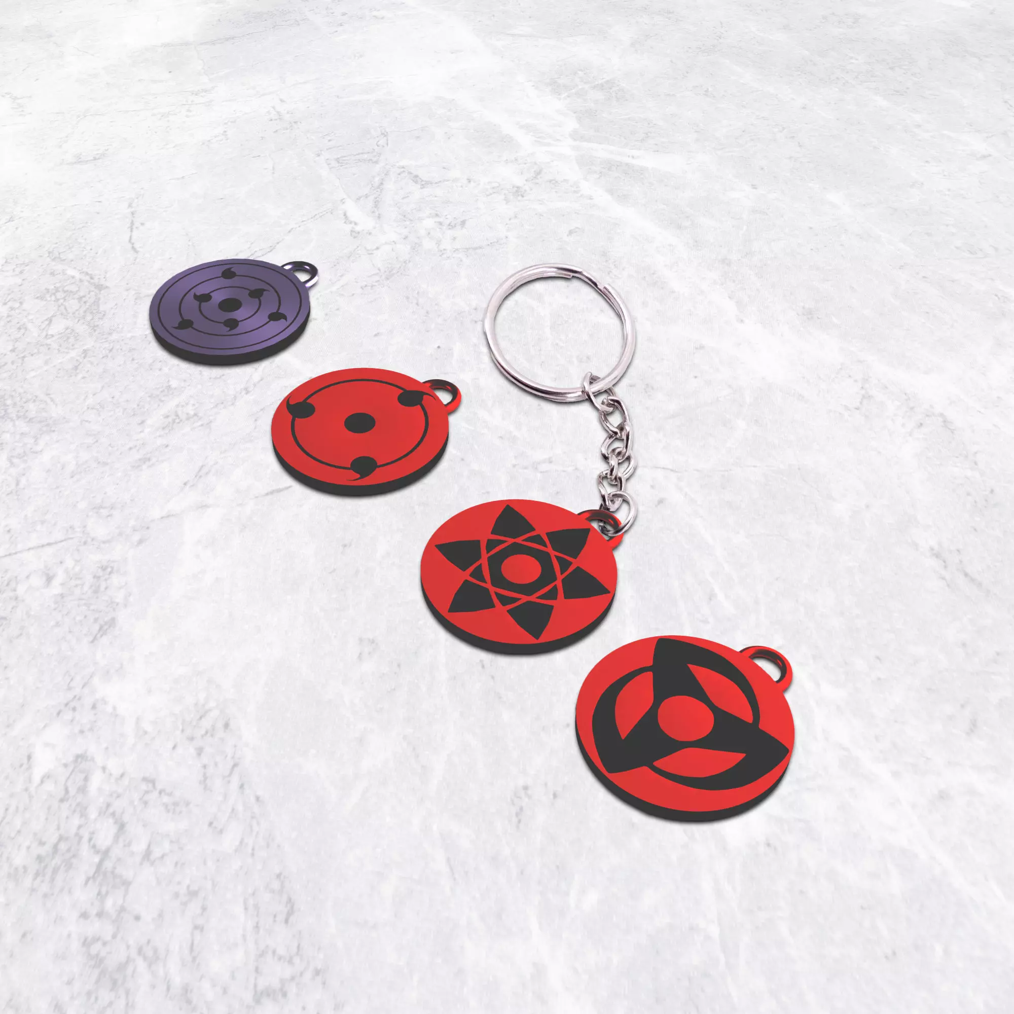 This is a detailed 3D model set featuring iconic eye symbols from the popular anime series Naruto: the Sharingan, Mangekyo Sharingan (various forms), and Rinnegan. Each charm is designed with a loop, making them perfect for creating pendants, keychains, earrings, or other custom jewelry.