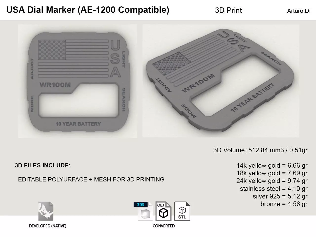 A watch dial marker compatible with the classic Casio Royal AE-1200. With the motive of the United States Flag.With a 3d volume of 513 mm3 or 0.51 gr (for casting purposes)