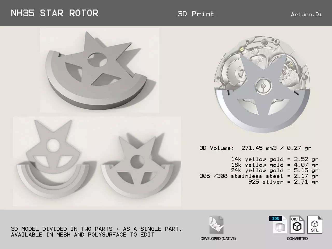 This model was made by disassembling and measuring a physical rotor of a generic NH35 movment.*Consider you need a ball bearing replacement for NH35 to use this rotor on your watch. This component can be bought on some online marketplaces that sell watch components.*Remember that physical 3d printed models in liquid resin can shrink up to 3%. [consider this before 3d printing]