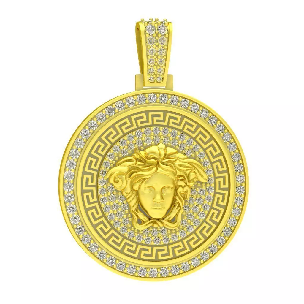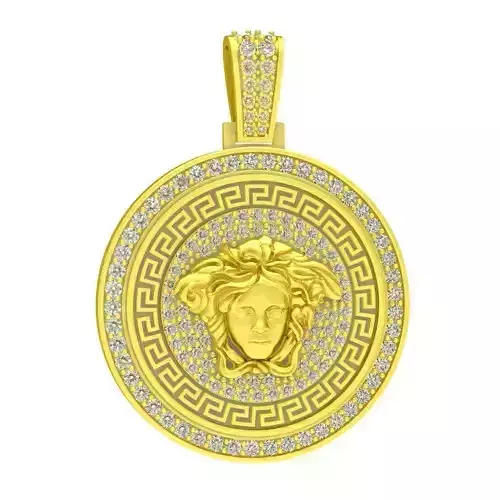 This luxury Medusa diamond pendant 3D model features a detailed classical Medusa head framed by a circular coin design with precise pavé stone settings. The bold relief and clean symmetry create a strong visual impact while maintaining refined luxury aesthetics.