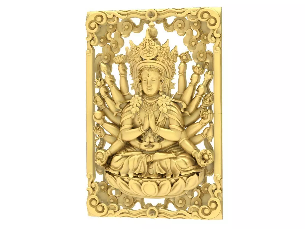 This Thousand Armed Buddha pendant is a highly detailed 3D jewelry model inspired by traditional Buddhist art and spiritual symbolism. The design features Avalokiteshvara seated in a calm meditative posture, surrounded by multiple arms representing compassion, wisdom, and protection.