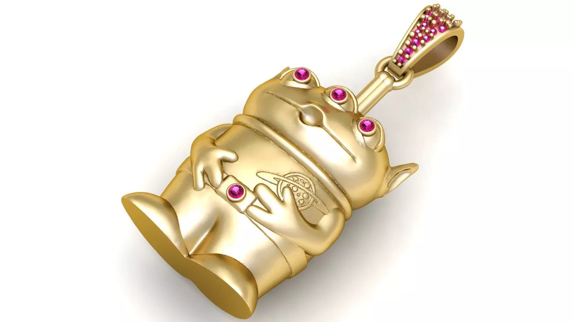 Ideal for those who love sci-fi themes, fantasy jewelry, or street-style accessories, this unique character pendant is both collectible and wearable. Cast it in gold, silver, or custom metallic finishes to elevate its intergalactic charm. The inset pink gemstones add a pop of color and sparkle, turning this whimsical design into a standout piece of art.