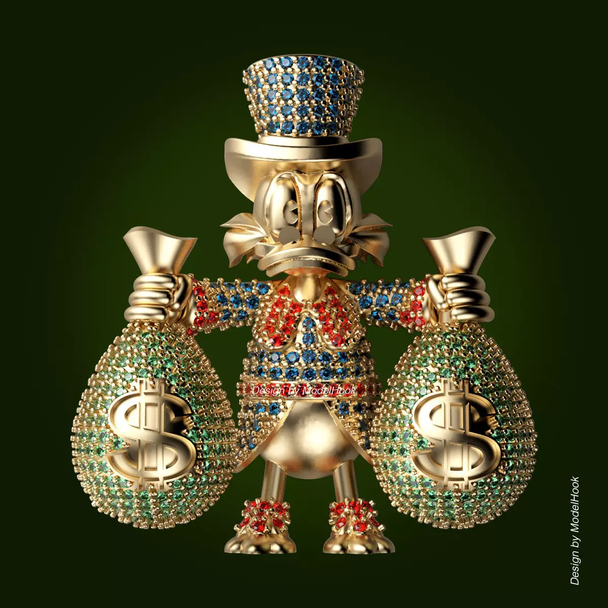 This detailed 3D model of a Scrooge McDuck pendant is designed specifically for jewelry casting in place, providing jewelers with a high-quality and customizable design. The pendant features a dynamic assembly structure, with the money bags designed separately from the main body for seamless post-production assembly.
