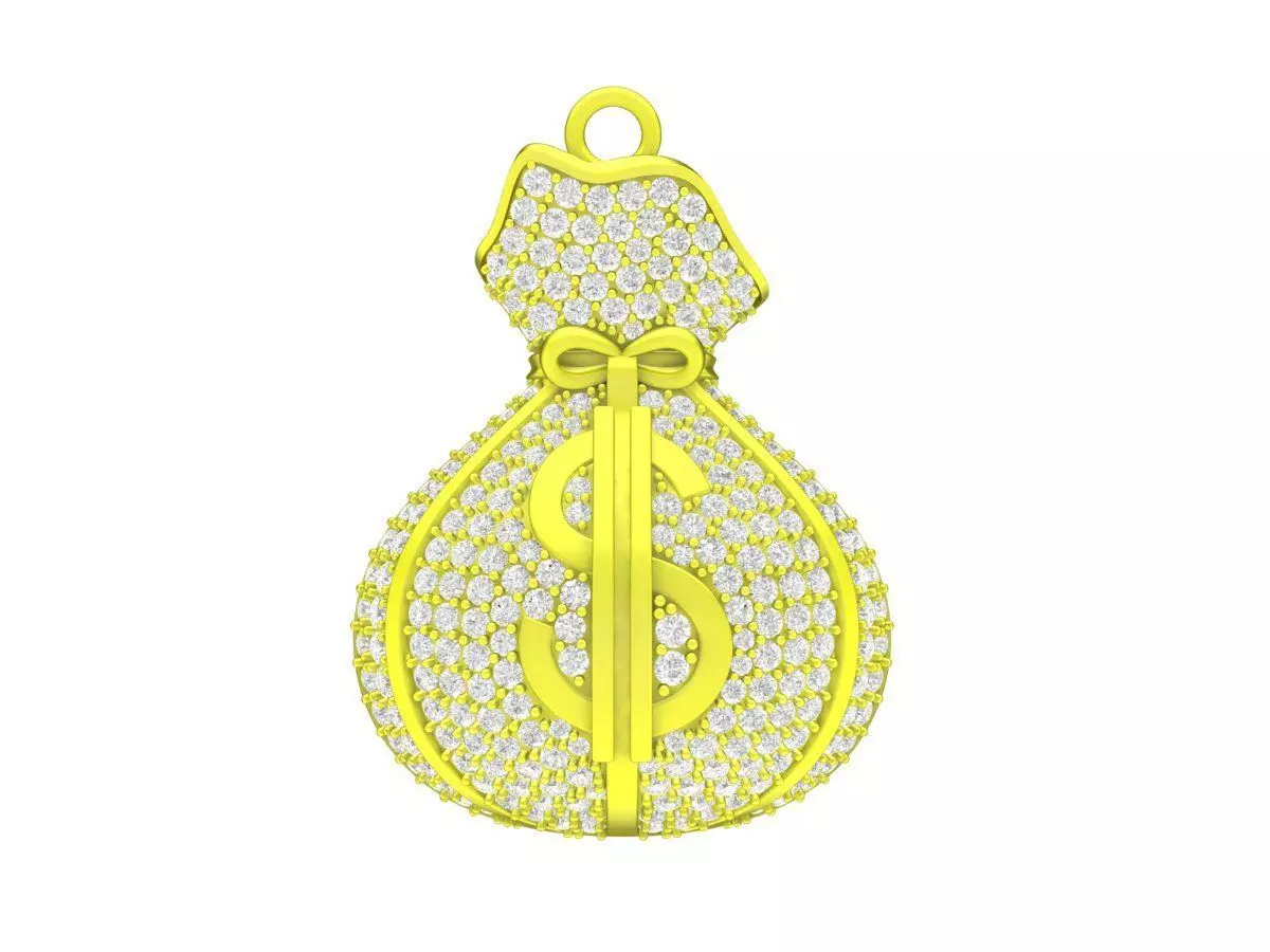 This money bag pavé pendant 3D model features a symbolic pouch-inspired design representing wealth, prosperity, and good fortune. The rounded body is fully decorated with pavé-set stones, while the central vertical element adds structure and a strong visual accent. The integrated bail is cleanly designed for secure attachment to chains or necklaces.
