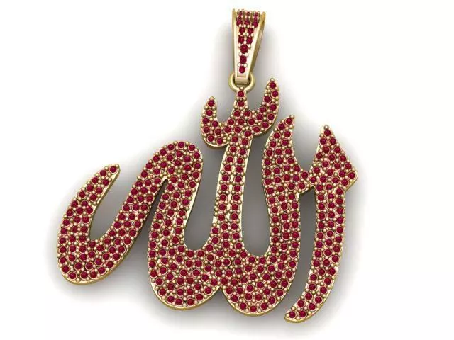 This Allah Name Pendant 3D Model features elegant Arabic calligraphy fully paved with beautifully arranged round gemstones. The design is crafted with great respect and attention to detail, giving it a luxurious and spiritual presence. Each curve of the calligraphy is covered with meticulously aligned stone settings, creating a radiant and eye-catching pave effect.