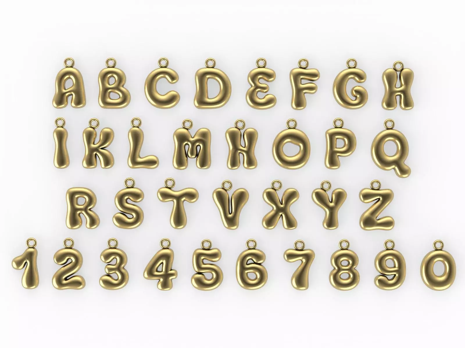 Item type: Complete 3D print ready Jewelry Toolkit: 26 Letters & 10 Numbers . There are flat and organic shapes of the numbers and letters, without any gemstones