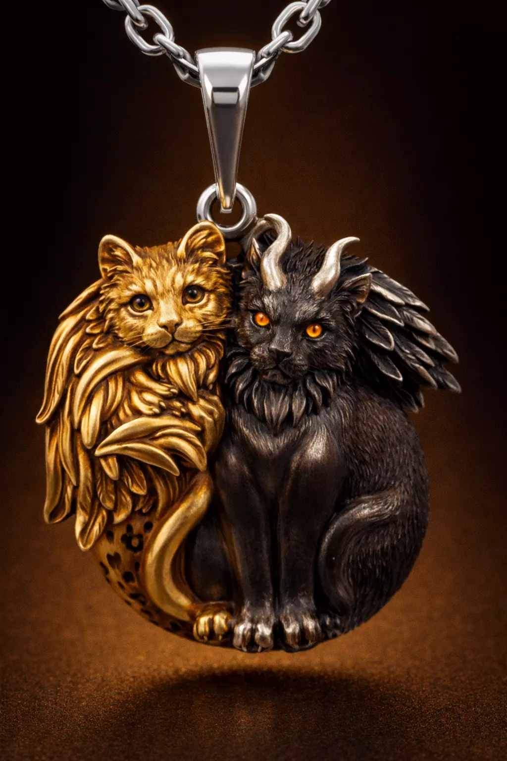 This masterfully sculpted medallion features two contrasting feline spirits: one an angelic guardian with intricate golden wings, and the other a demonic protector with sharp horns and a sleek, dark aesthetic. The composition flows in a circular Yin-Yang style, making it a perfect symbol of balance, companionship, or the dual nature of the feline spirit. Designed for high-precision casting, the varying textures of fur, feathers, and horns will create a stunning visual contrast in any precious metal.