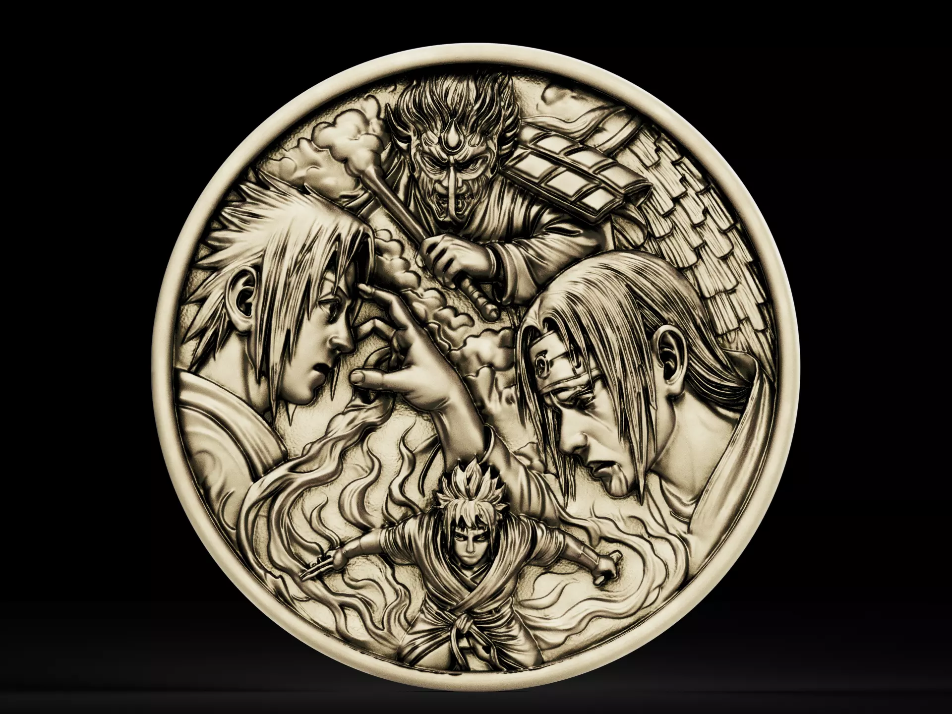 Elevate your collection with this highly detailed 3D bas-relief coin pendant, inspired by an iconic moment of brotherhood and power. Designed with precision, the piece captures the emotional intensity of two legendary figures, framed by the awe-inspiring presence of Susanoo. Every curve, expression, and ornamental detail is sculpted to perfection, creating a design that feels both artistic and powerful.