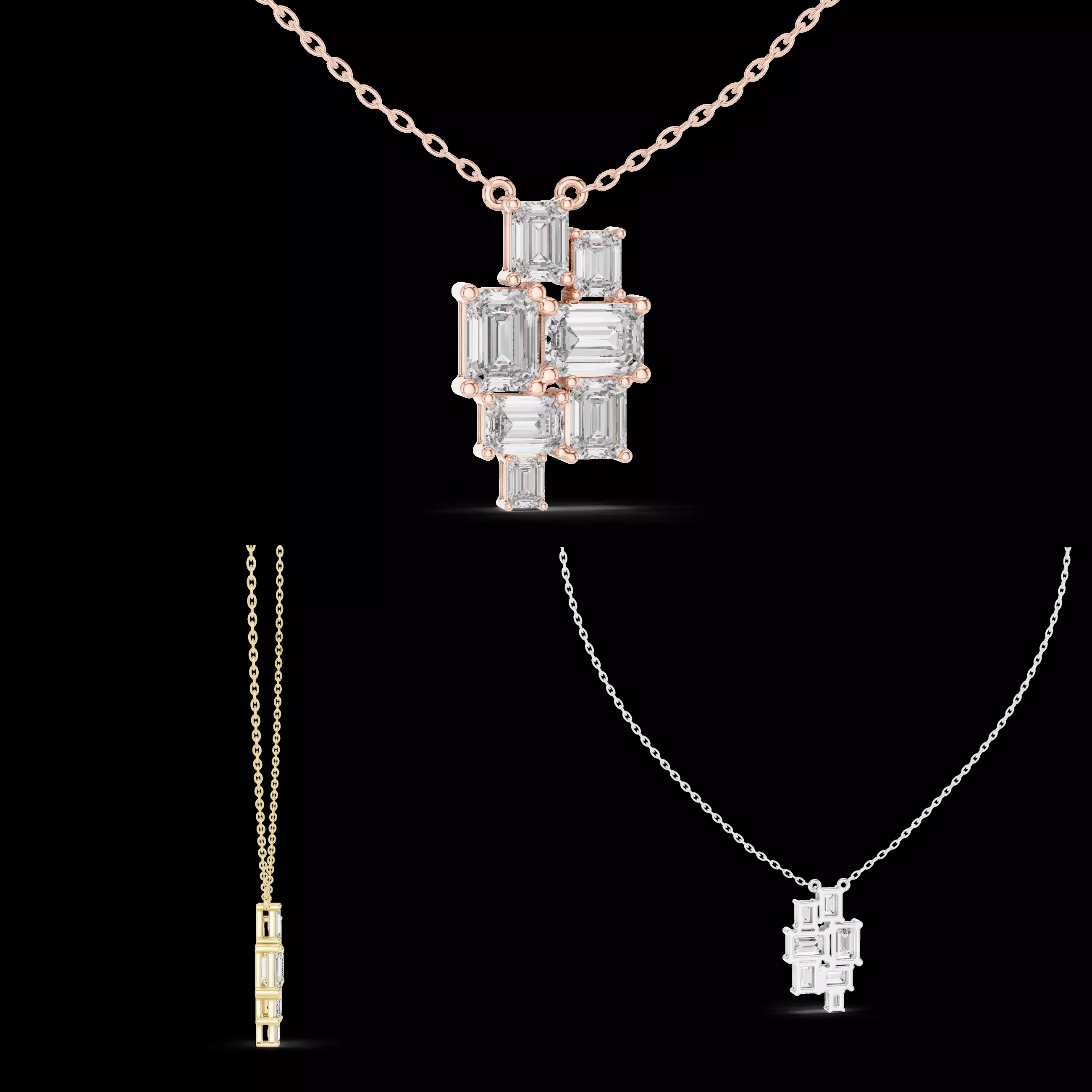 This elegant geometric pendant features a refined composition of baguette-cut diamonds arranged in a modern, architectural layout. The design reflects a perfect balance between contemporary aesthetics and timeless luxury, making it suitable for high-end fine jewellery production.