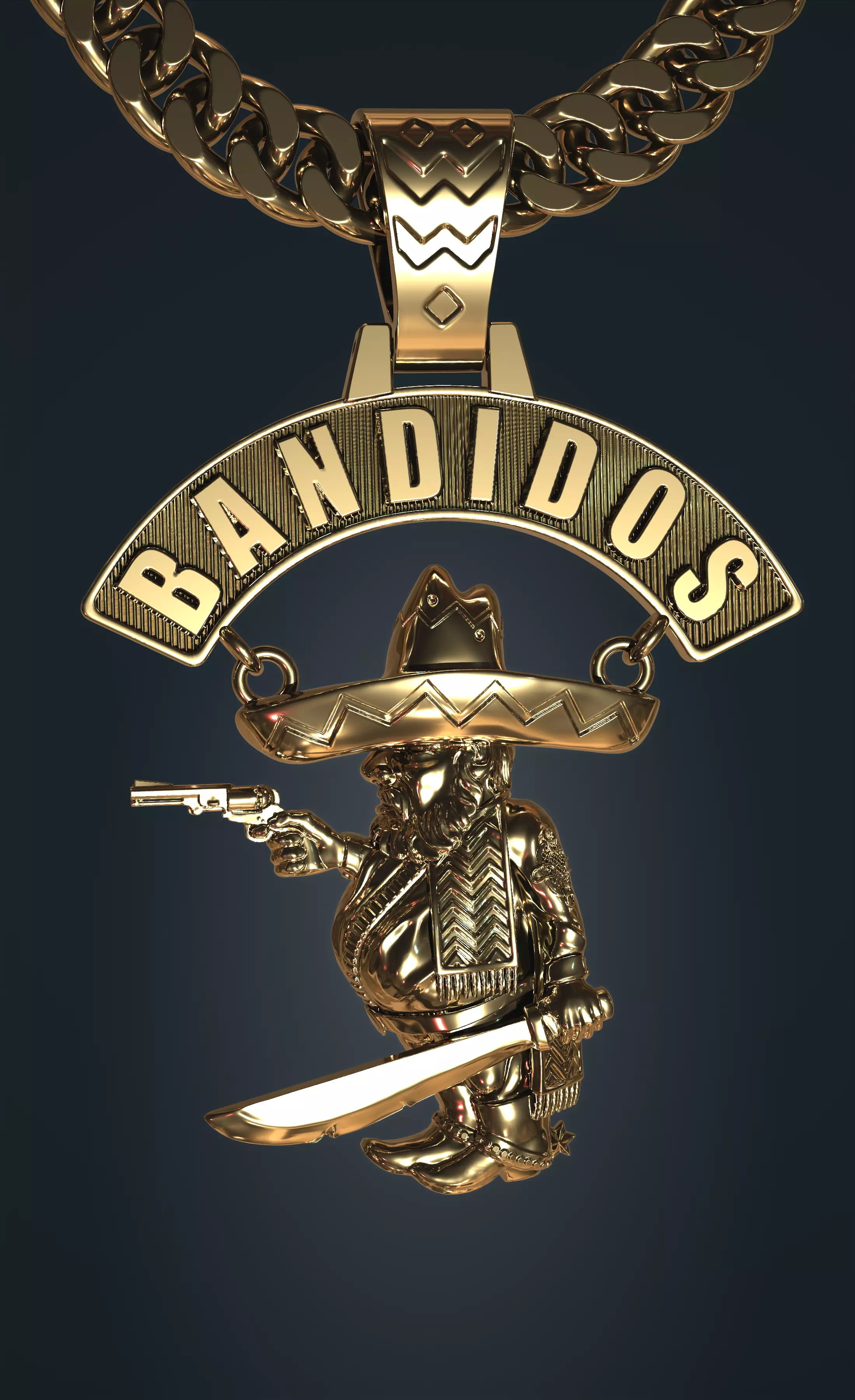 Bandidos MC Style Pendant - Jewelry 3D Model High-quality, detailed 3D model of a jewelry pendant inspired by the Bandidos theme. The model features a stylized character wearing a traditional sombrero, holding a revolver in one hand and a machete in the other. Above the character is a curved rocker plate with the text BANDIDOS.