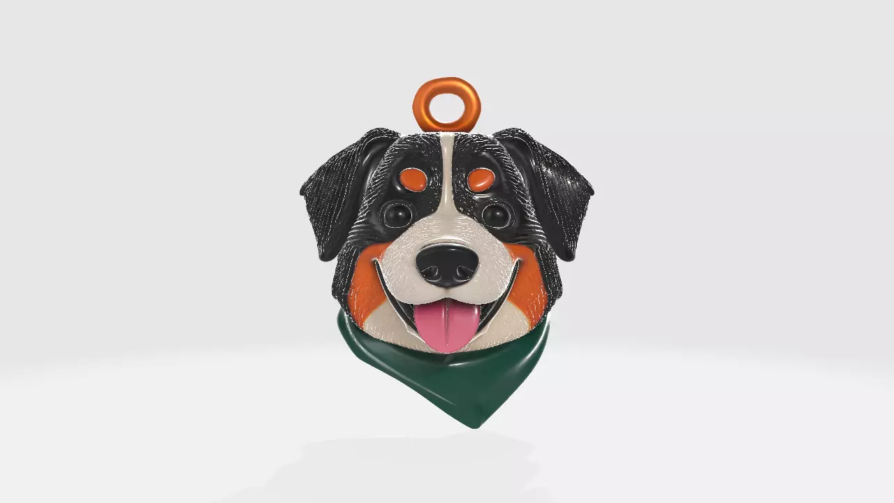 This 3D model features a charming Bernese Mountain Dog face with its signature tricolor coat—black, white, and rust—captured in a playful, smiling expression. The design includes a green bandana for added personality, and a loop at the top for easy attachment to collars, keychains, or decorative uses. Perfect for dog lovers, pet owners, or anyone who wants to add a touch of canine charm to their accessories.