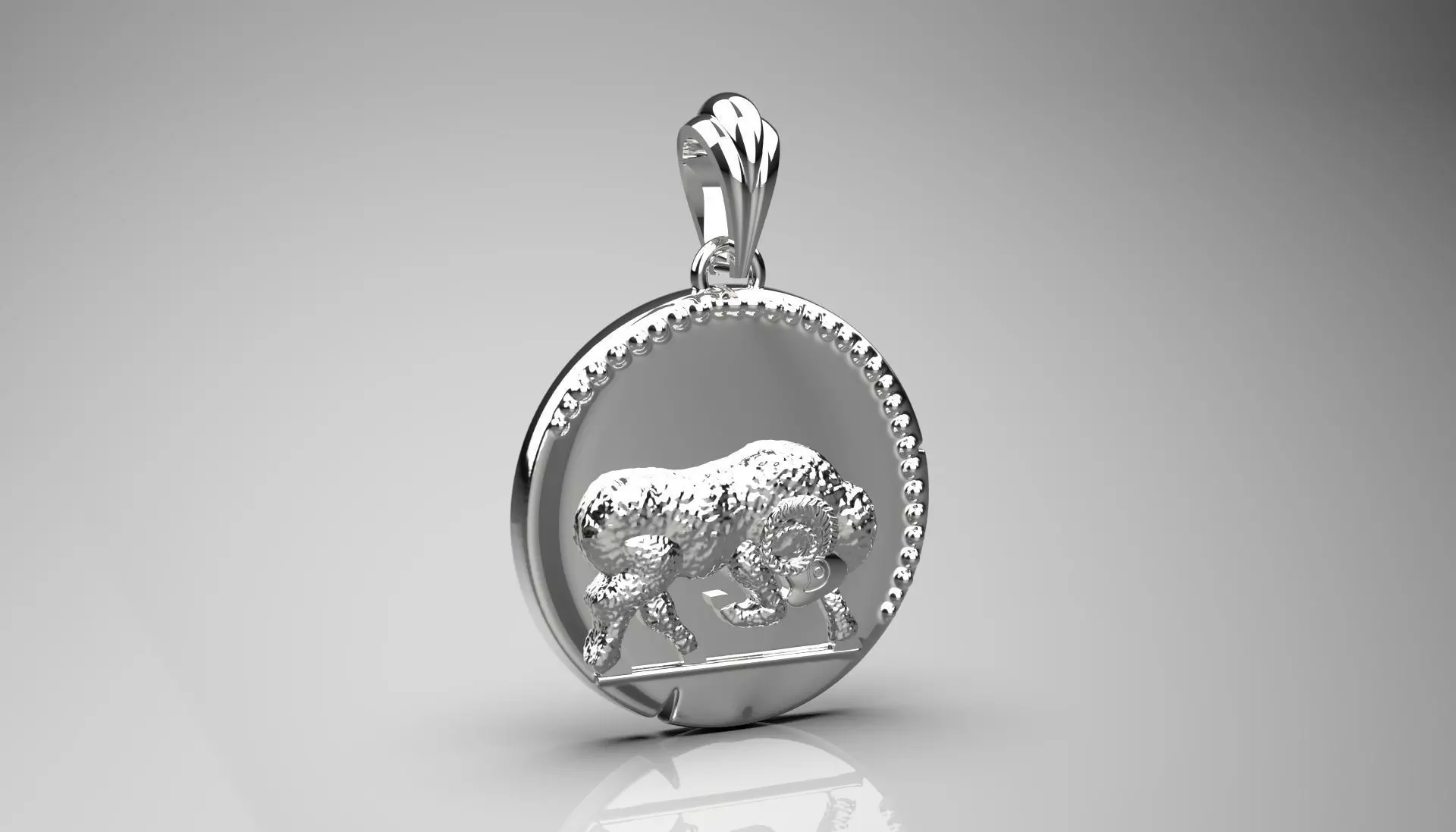 This round white gold pendant is designed specifically for the birth month of April. In the center, a symbol of the April zodiac sign, such as a ram or an image related to this month, is prominently displayed in bold detail. The edges of the pendant are decorated with beautiful patterns or curved lines. This stylish and unique design can be a great option for a gift or personal jewelry.