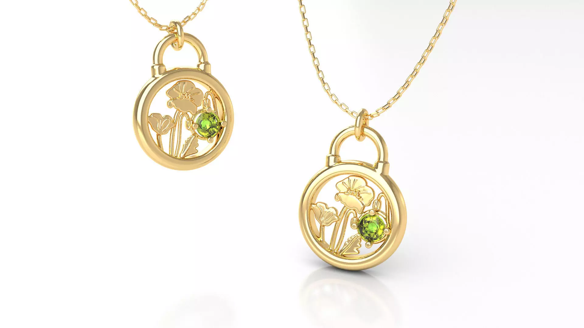 Simple, and dainty yet solid pendant with beautifully arranged August's birth-flower 'Poppy' inside a padlock shaped pendant. Finished product preferably to be adorned with peridot or light green cubic zirconia stone -- as August's birth stone.