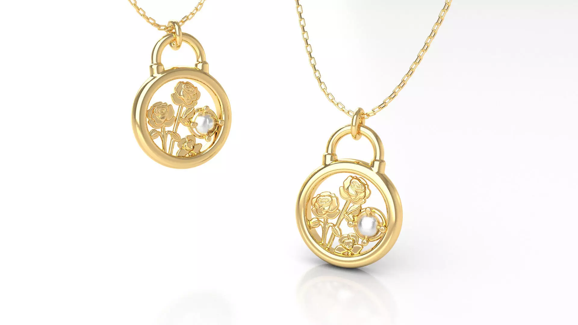 Simple, and dainty yet solid pendant with beautifully arranged June's birth-flower 'Rose' inside a padlock shaped pendant. Finished product preferably to be adorned with pearl or alexandrite -- as June's birth stone.