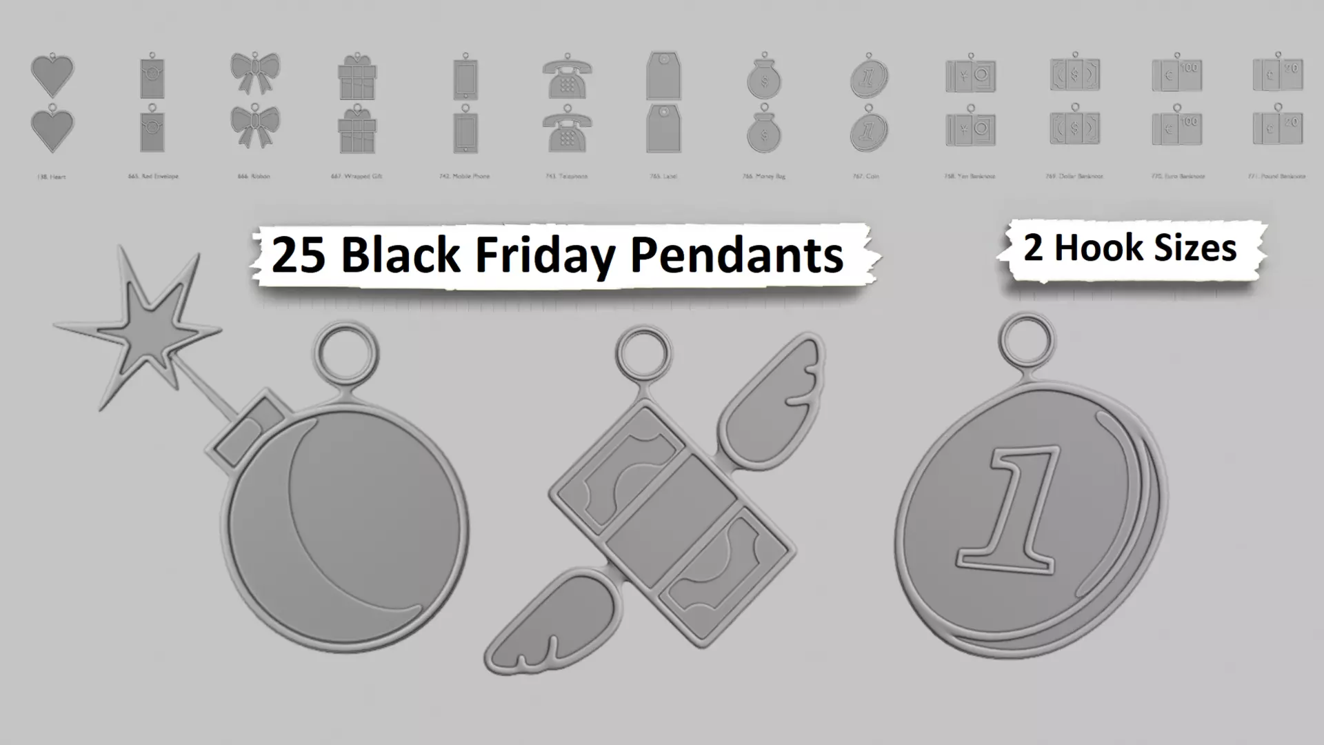 Gear up for the ultimate sale season with this Black Friday themed pendant collection – ideal as necklace charms, keychains, tags, or even cheeky gift add-ons! All designs come in two hook size variations, exported from the Original Blend and ready to 3D print in STL format.Icons sourced from OpenMoji, the open-source emoji project. License: CC BY-SA 4.0What’s in your shopping cart? Money & Value Icons