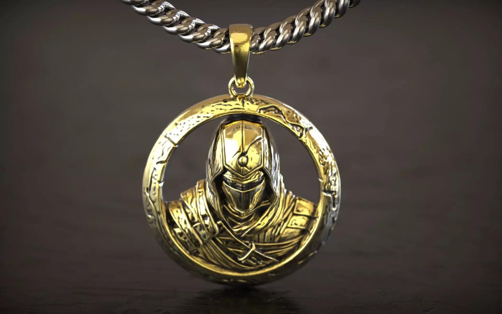 This professional-grade 3D model features a masked shinobi enclosed in a rugged, circular frame with a weathered battle-worn texture. The design is rich with layered fabric textures on the hood and mask, emphasizing a high-detail aesthetic that is perfect for jewelry designers and 3D printing enthusiasts. Whether you're creating a piece for a gaming fan or a custom martial arts accessory, this model is engineered for high-quality production.