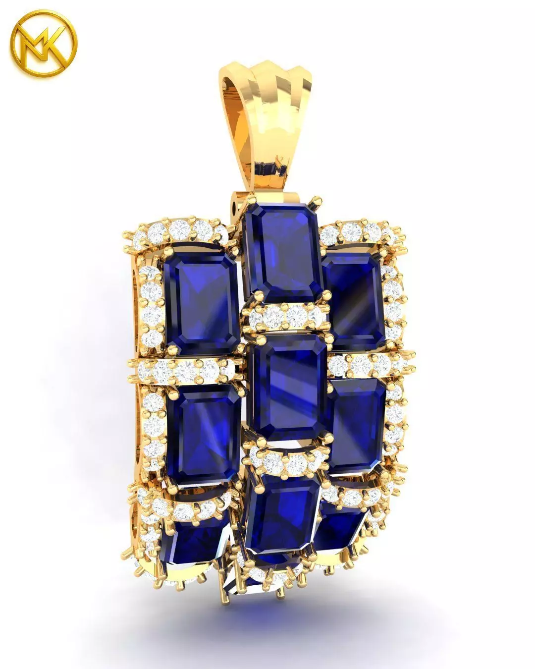 Blue Sapphire Grid Pendant is a high-detail 3D model of a luxurious Custom Rectangular Cluster Pendant, expertly designed for jewelry manufacturing and high-end rendering.