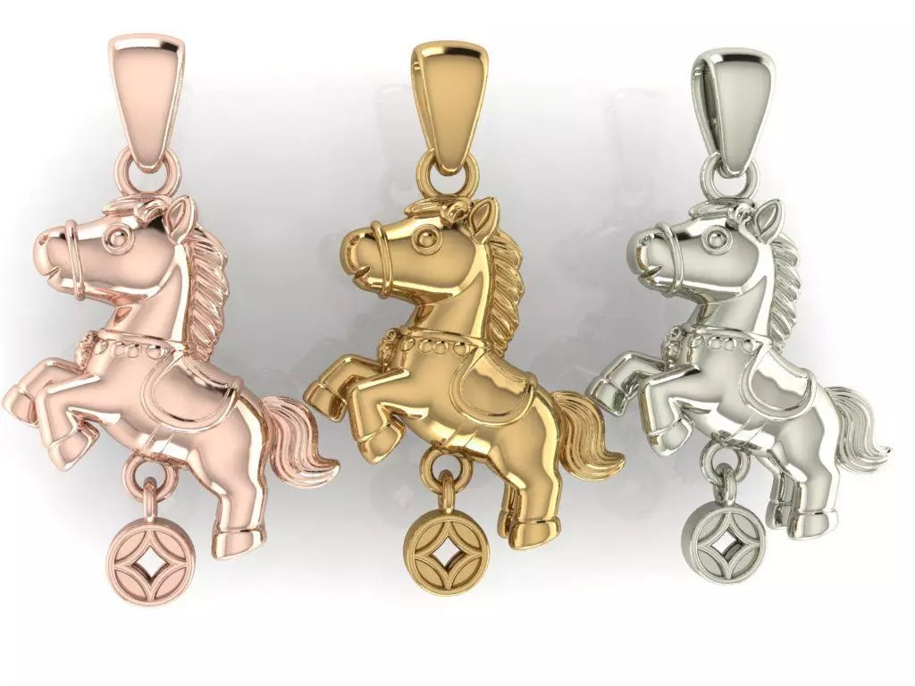 Elegant carousel horse pendant designed for fine jewelry production. A playful yet luxurious design featuring detailed mane, saddle accents and a delicate dangling coin charm. Perfect for Pandora-style bracelets or standalone pendants.