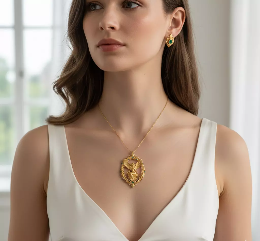 This magnificent pendant captures the elegance and power of an angelic figure, beautifully perched within an ornate frame of golden leaves. The angel, with outstretched wings, symbolizes freedom and grace. Surrounded by sparkling diamonds and vibrant emerald gemstones, this piece exudes luxury and divine charm. Designed with intricate detail, this necklace is a perfect blend of artistic beauty and spiritual elegance, ideal for those who seek a statement piece with a celestial touch.