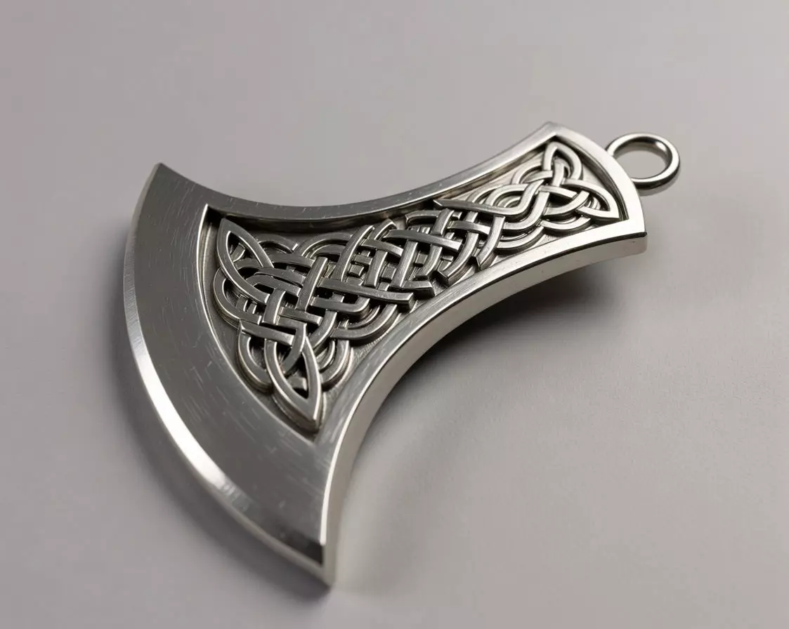 Modern Celtic axe pendant featuring an elegant trinity knot ornament framed within a clean, curved blade form. The design blends Nordic minimalism with traditional Celtic symbolism, creating a bold yet refined piece suitable for everyday wear or statement jewelry.