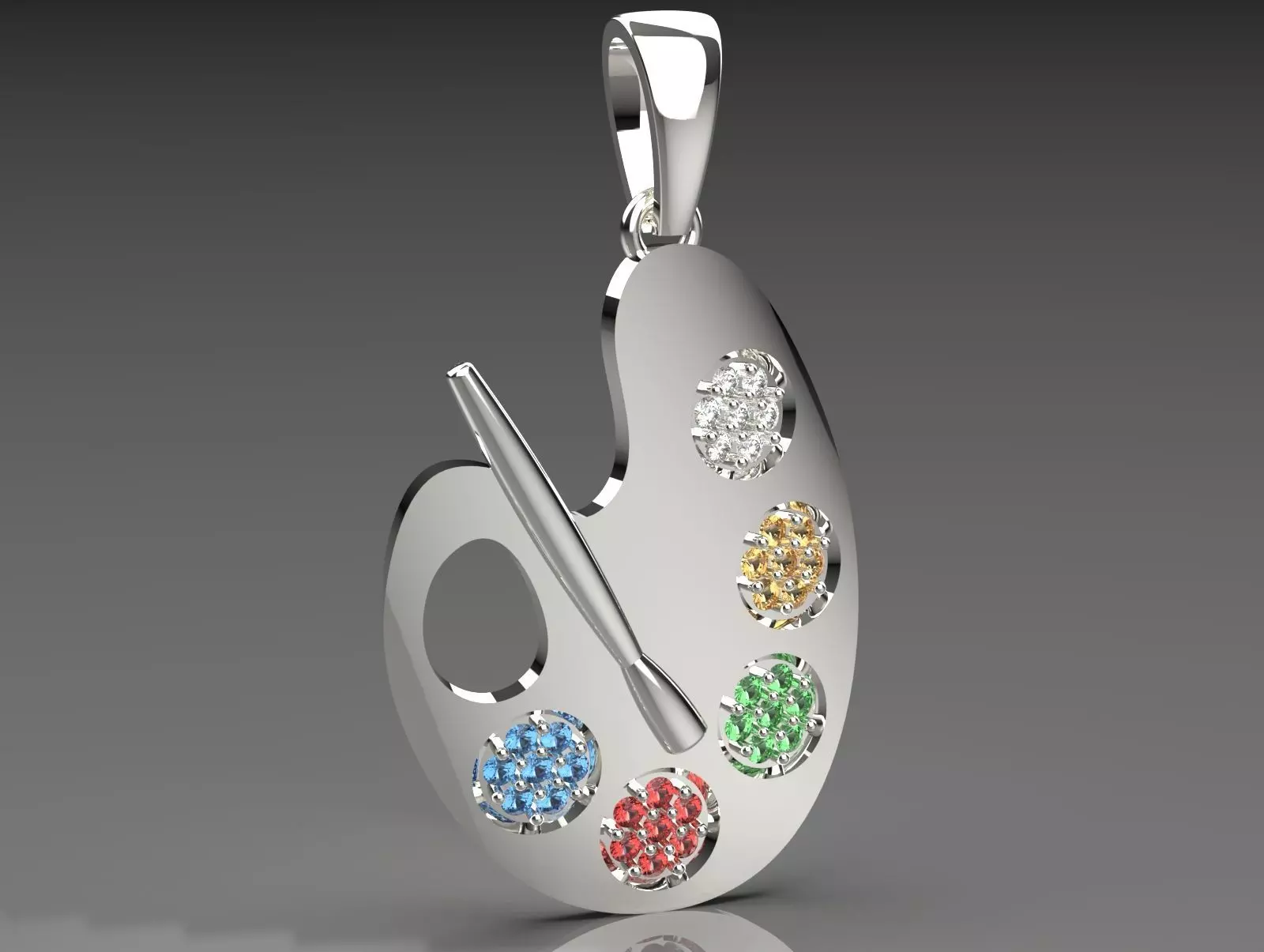 This image shows a stylish pendant designed in the shape of an artist's palette, symbolizing creativity and art. The palette is made of shiny metal, likely silver or white gold, with five small, colorful gemstones representing paint blobs in red, green, blue, yellow, and white. A small, sleek rod crossing the palette mimics a paintbrush, adding to the artistic theme. The pendant has a simple bail at the top for attaching to a chain, making it a unique accessory for art lovers.