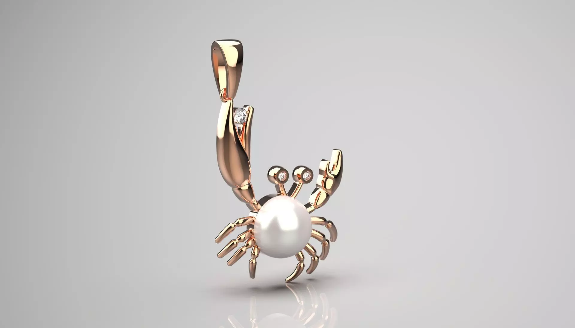The image features a beautifully designed crab pendant. It is made of rose gold, giving it a warm and elegant color. The crab's body is highlighted with a large, shiny pearl in the center, which adds a striking contrast to the metallic colors.