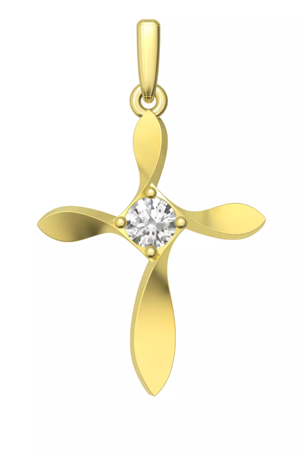 This premium 3D jewelry model features a modern cross-shaped diamond pendant crafted in yellow gold. The design showcases smooth, flowing arms forming a contemporary cross silhouette, accented by a single round brilliant-cut white diamond set at the center in a secure prong setting.