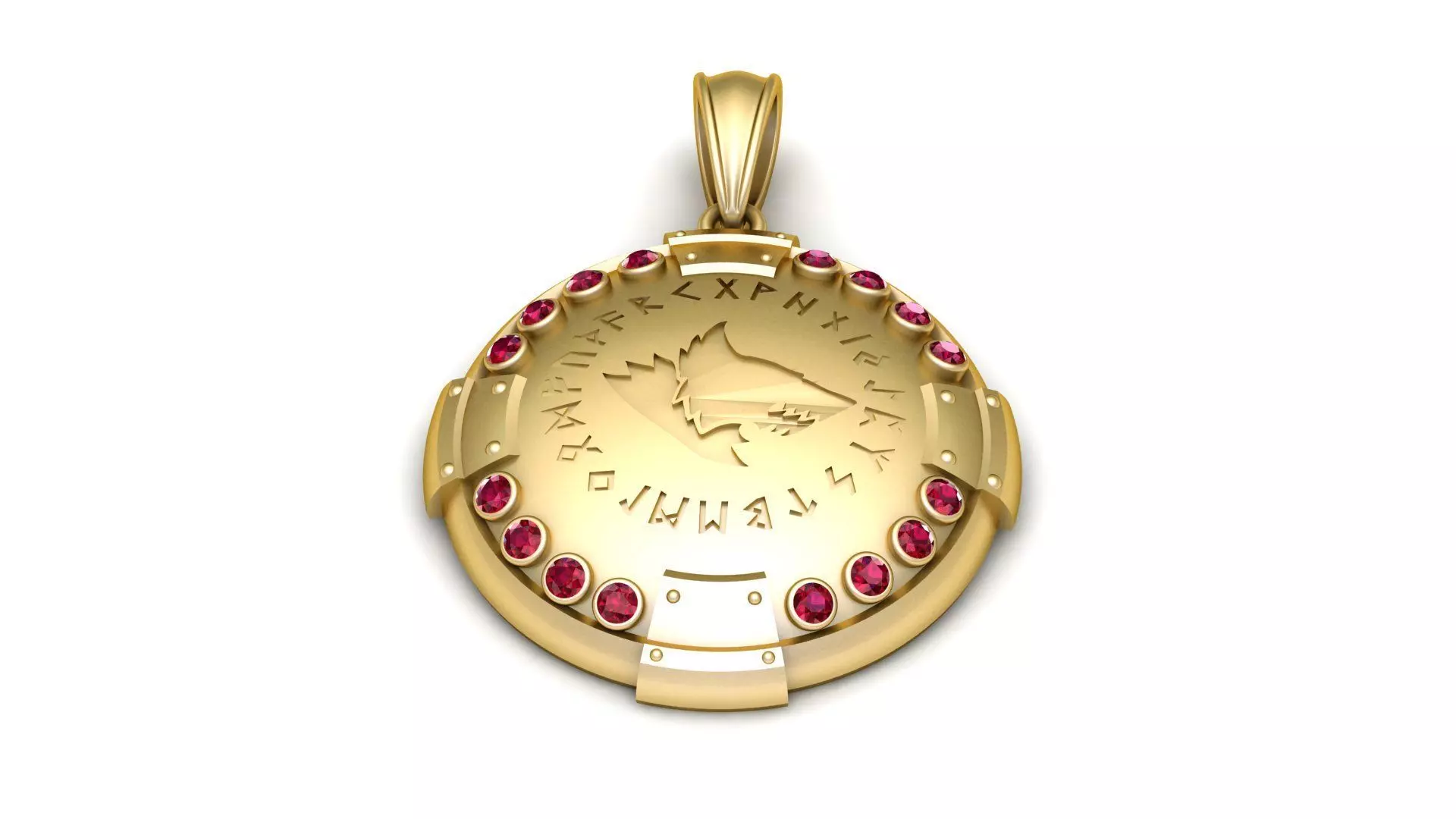 This striking pendant features a round medallion design crafted in rich yellow gold, evoking a mystical and ancient aesthetic. The center showcases a bold, engraved emblem resembling a stylized wolf or beast, surrounded by intricate runic or symbolic engravings, adding an element of mystery and enchantment. The outer border is adorned with vivid red gemstones, offering a stunning contrast against the polished gold surface. Reinforced with metallic-inspired accents, the pendant carries a unique combination of fantasy, mythology, and high-end craftsmanship — perfect for collectors, cosplay enthusiasts, or anyone seeking a statement piece with character and history.