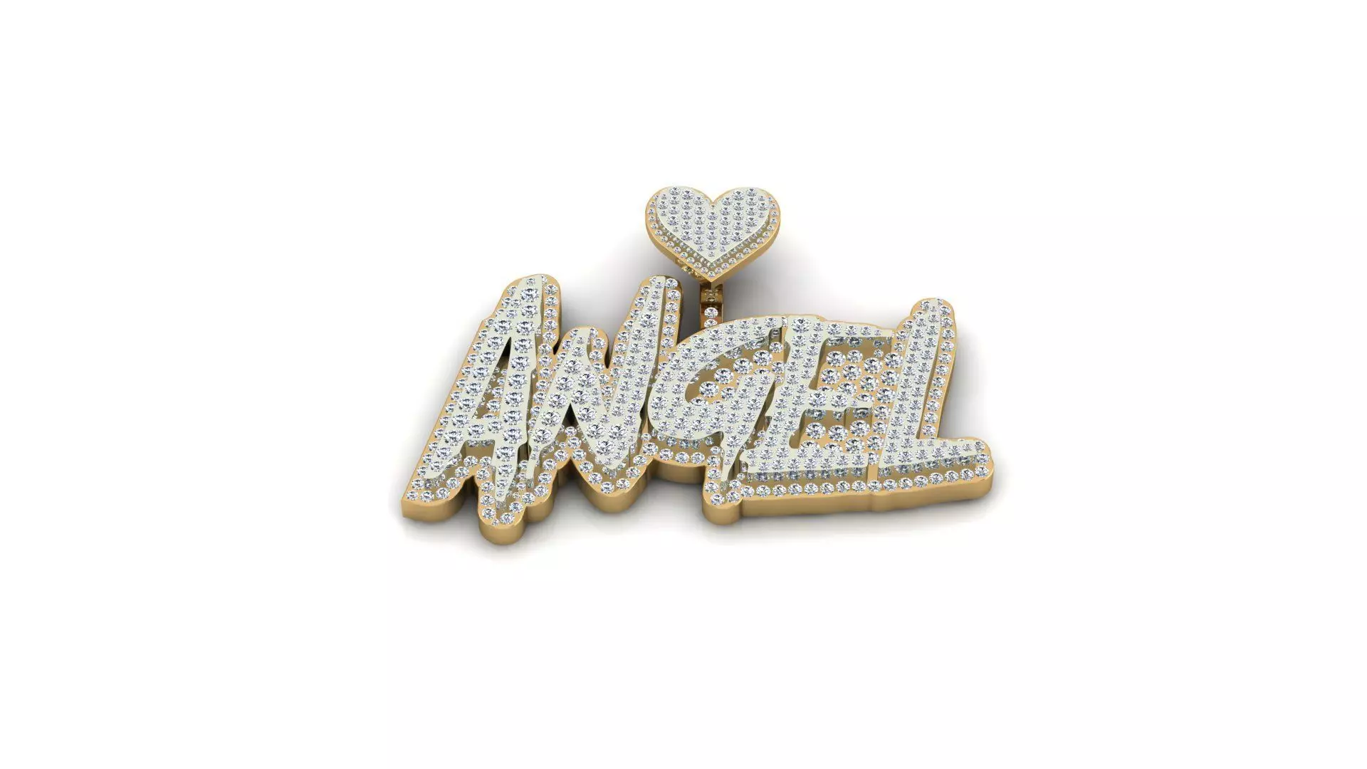 This jewel is a bold nameplate pendant designed as the word ANGEL in a stylized, block-like script with a heart motif positioned above it. It is heavily adorned with diamonds.