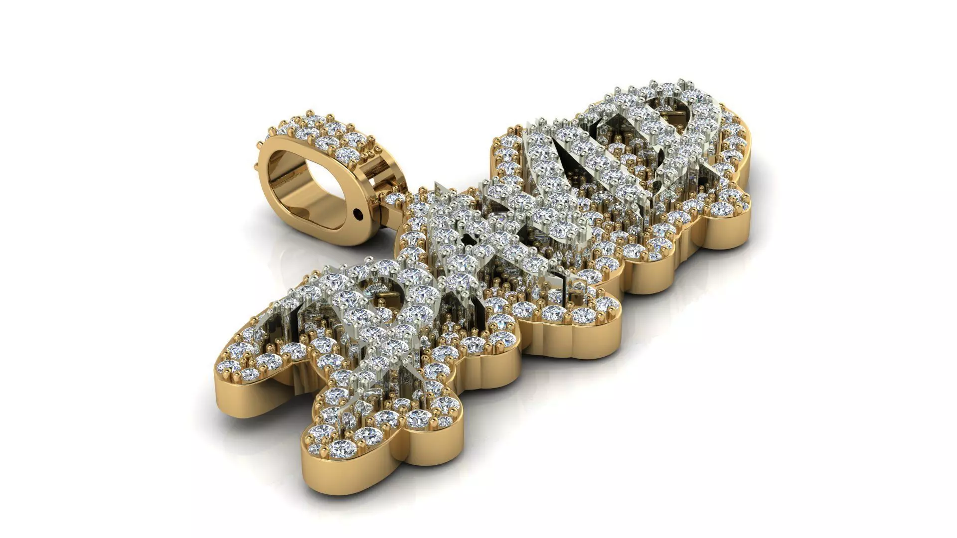 Design Elements:The main body of the pendant has an organic, fluid shape, reminiscent of a stylized cloud or perhaps a flowing script, fully pave-set with diamonds.The bail is an integrated, elongated oval shape, also pave-set with diamonds on its exposed surfaces.The setting style appears to be pave, where small diamonds are set closely together to create a continuous sparkling surface.