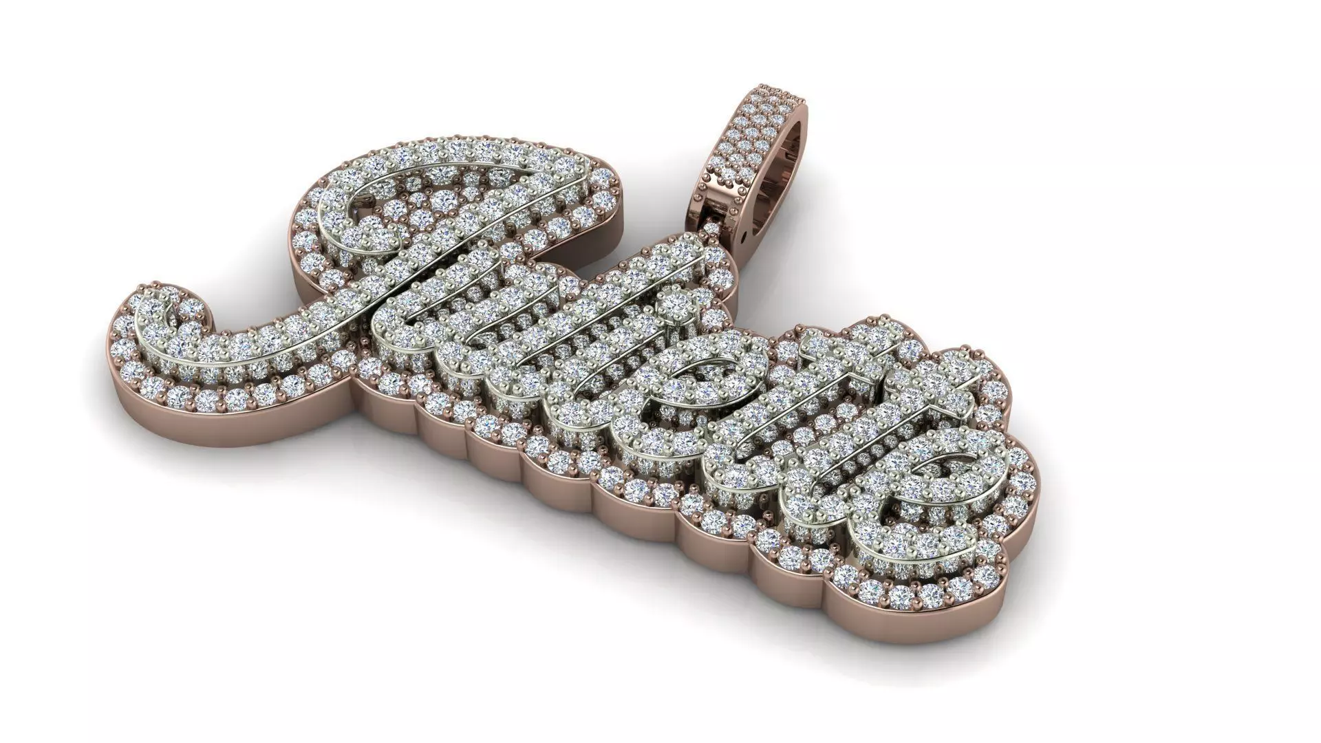 Design Elements:The pendant features the name Juliette in a curvilinear script. The entire front surface of the lettering is comprehensively pave-set with numerous round diamonds, creating a continuous and brilliant surface. The range of diamond sizes is utilized to effectively fill the contours of the letters, ensuring maximum sparkle. An integrated bail, also fully pave-set with diamonds, extends vertically from the top of the J, designed for suspension on a chain. The side view indicates a robust construction with a base thickness of 2.00 mm and an elevated setting for the diamonds, contributing to an overall depth of 5.00 mm.