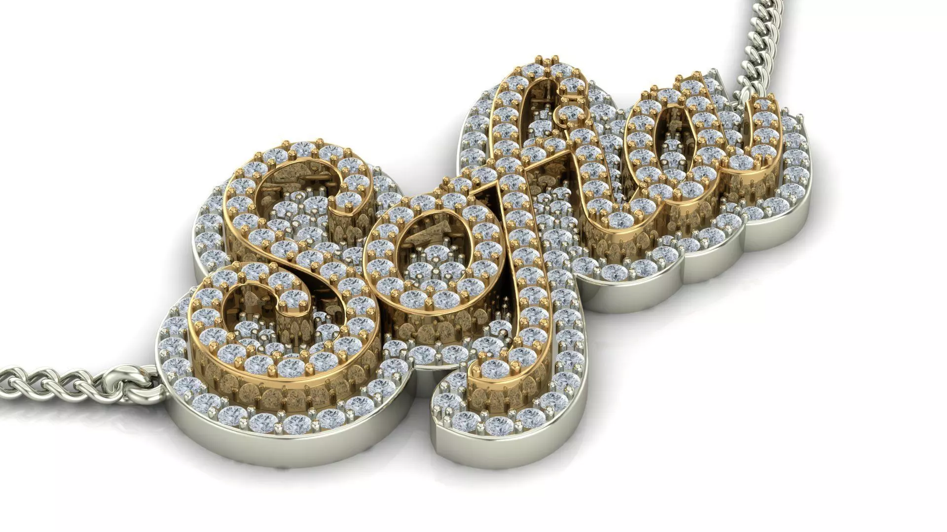 Design Elements:The pendant features the name Sofia in a sweeping, cursive script. The entire top surface of the lettering is lavishly pave-set with numerous round diamonds, creating a brilliant and continuous sparkle. The use of various diamond sizes ensures optimal coverage and a seamless appearance across the curves and details of the script. The side view reveals a substantial and solid construction, with a base thickness of 2.00 mm, suggesting robust craftsmanship. The piece is equipped with an integrated, simple circular bail on each end of the name, designed for suspension.