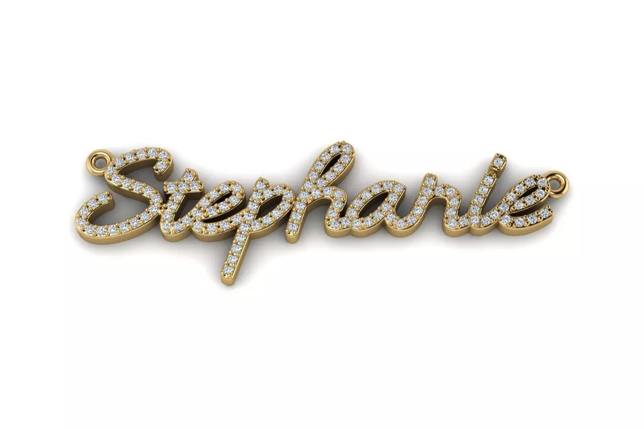 Design Elements:The pendant features the name Stephanie rendered in a graceful, flowing script. The entire top surface of the lettering is pave-set with numerous round diamonds, creating a continuous and brilliant sparkle. The piece includes an integrated, simple circular bail on each end of the name, designed for suspension.