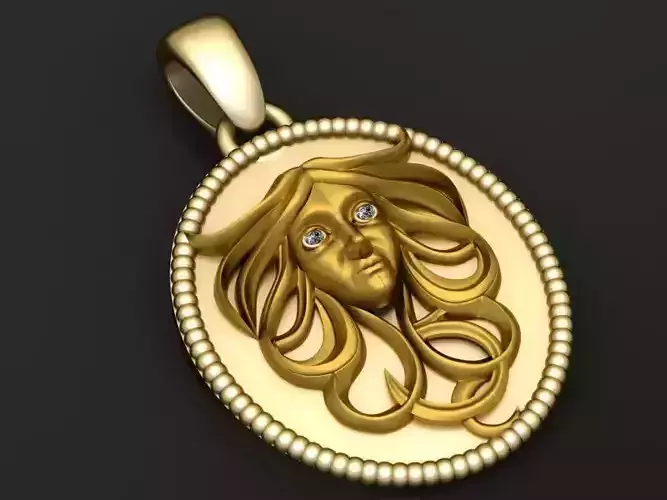 This artistic 3D model features a captivating round gold pendant showcasing a sculpted female face with flowing, stylized hair that extends gracefully across the design. The hair’s fluid curves create a sense of movement, while two brilliant-cut diamonds set in the eyes add a mesmerizing sparkle. The pendant is framed by a beaded gold border, giving it both a refined finish and an elegant vintage touch. This piece blends fine artistry with luxurious craftsmanship, making it ideal for high-end jewelry collections.