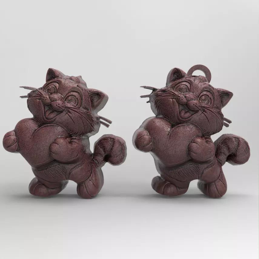 Printing Considerations:Support-Free Design: To make it easier for 3D printing, the model should avoid steep overhangs. The cat’s pose should be simple, possibly sitting or standing, with its tail curled around its body to support the overall structure during printing.Material Choice: Depending on the material (like PLA or resin), the model can have different finishes. For example, PLA can be used for matte finishes, while resin printing can provide a smoother, glossy texture for the fur and heart pendant.Scale and Detail: The model should be scaled appropriately for printing. Fine details, like the eyes, nose, and heart pendant, should be large enough for the printer to capture them without sacrificing resolution. It may be best to print at a resolution of around 0.1mm for fine details.Assembly or One-Piece Model: To avoid the complexity of assembly, the model can be designed as a single piece, ensuring the pendant and cat’s body are fused seamlessly. However, for a more customizable design, the pendant could be printed separately and attached afterward.Post-Processing: After printing, you can add a bit of paint or gloss to the pendant to make it stand out more. The pendant could be painted in metallic or pastel colors, while the cat could be in a soft, pastel shade (light gray, white, or cream).