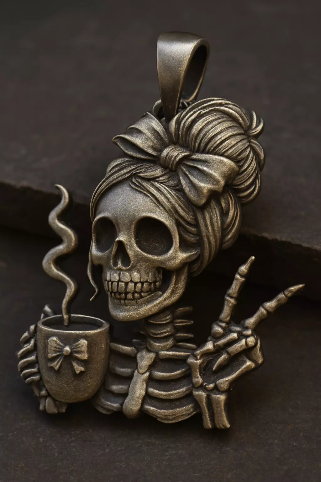 Celebrate your eternal love for caffeine with this whimsical and highly detailed skeleton pendant. Cast in radiant gold, this piece features a skeleton with a stylish messy bun and bow, holding a steaming cup of coffee while flashing a peace sign. It’s a perfect blend of gothic aesthetic and relatable humor, designed for those who don’t feel alive until their first sip. A standout conversational piece that adds a touch of spooky-chic to any everyday look.