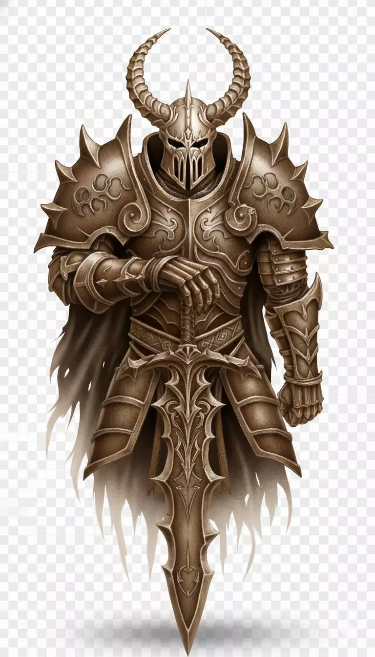 The sculpt showcases fine detailing across the helmet armor gauntlets and leg plates, with a tattered lower cloth adding depth and realism to the silhouette. The horned helmet and sharp armor lines make this model ideal for dark fantasy projects medieval themed games cinematic renders and collectible statues.