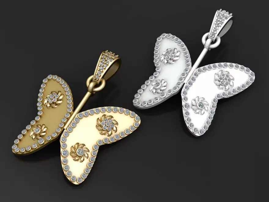 This exquisite pendant design captures the grace and charm of butterfly wings in an artistic and luxurious form. Crafted in both radiant yellow gold and pristine white gold finishes, each wing is outlined with a stunning row of sparkling diamonds that elevate the design with brilliance and elegance. The pendant is further adorned with intricately designed floral motifs, each centered with a gleaming diamond to enhance the pendant’s feminine allure. A diamond-encrusted bail adds the perfect finishing touch, making this piece a beautiful blend of nature-inspired beauty and fine craftsmanship—ideal for women who embrace elegance with a whimsical twist.